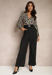 Czarno-Beżowy Kopertowy Kombinezon z Prostymi Nogawkami i Wzorzystą Górą z Paskiem w Talii Tinorielle