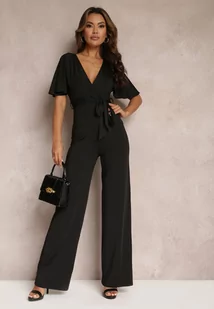 Czarny Długi Kombinezon z Wiązaniem i Głębokim Kopertowym Dekoltem Sumya