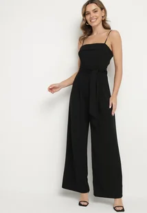 Czarny Kombinezon Ozdobiony Paskiem z Szerokimi Nogawkami Deolise