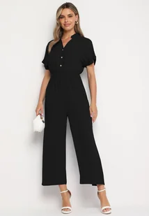 Czarny Wiskozowy Kombinezon o Taliowanym Kroju z Szerokimi Nogawkami Delsea