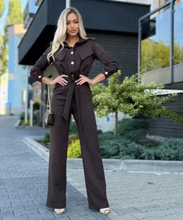 ELEGANCKI KOMBINEZON W KOLORZE CZEKOLADY– POLSKA PRODUKCJA – PREMIUM QUALITY Poczuj się pewnie, stylowo i niesamowicie kobieco! Szukasz alternatywy dla klasycznej sukienki? Prezentujemy absolutny hit sezonu – stylowy kombinezon, który łączy w sobie biurową elegancję, wieczorny szyk i najwyższy komfort noszenia. To fason stworzony dla kobiet, które chcą wyglądać profesjonalnie, a zarazem przyciągać spojrzenia. DLACZEGO WARTO WYBRAĆ TEN MODEL? Perfekcyjnie dopracowana góra Góra kombinezonu została zaprojektowana z dbałością o każdy szczegół. Klasyczny kołnierzyk nadaje całości szyku, a efektowne złote napy stanowią luksusowy akcent, który zastępuje biżuterię. To połączenie sprawia, że kombinezon idealnie wpisuje się w dress code „power dressing”.