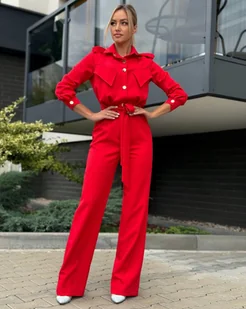 ELEGANCKI KOMBINEZON W KOLORZE CZERWONYM– POLSKA PRODUKCJA – PREMIUM QUALITY Poczuj się pewnie, stylowo i niesamowicie kobieco! Szukasz alternatywy dla klasycznej sukienki? Prezentujemy absolutny hit sezonu – stylowy kombinezon, który łączy w sobie biurową elegancję, wieczorny szyk i najwyższy komfort noszenia. To fason stworzony dla kobiet, które chcą wyglądać profesjonalnie, a zarazem przyciągać spojrzenia. DLACZEGO WARTO WYBRAĆ TEN MODEL? Perfekcyjnie dopracowana góra Góra kombinezonu została zaprojektowana z dbałością o każdy szczegół. Klasyczny kołnierzyk nadaje całości szyku, a efektowne złote napy stanowią luksusowy akcent, który zastępuje biżuterię. To połączenie sprawia, że kombinezon idealnie wpisuje się w dress code „power dressing”.