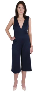Elegancki, granatowy kombinezon ze spodniami. Posiada dekolt w literę V, który pięknie wydłuża szyję. Gruby pas w talii podkreśla ją, luźne spodnie 3/4 wysmu...
