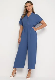 Granatowy Wiskozowy Kombinezon o Taliowanym Kroju z Szerokimi Nogawkami Delsea