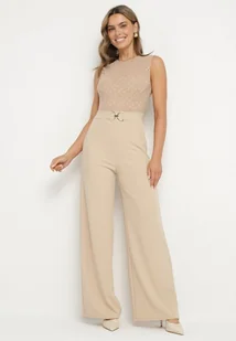 Jasnobeżowy Kombinezon bez Rękawów z Metaliczną Ozdobą i Prostymi Nogawkami Karivalle