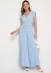 Jasnoniebieski Kombinezon o Kopertowym Kroju z Plisami i Paskiem w Talii Salivania