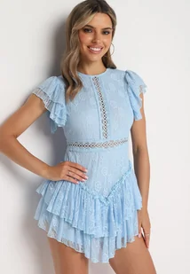 Jasnoniebieski Taliowany Koronkowy Kombinezon z Ażurowymi Wstawkami i Falbanami Tinarosi