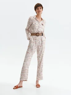 Kombinezon damski Top Secret w zwierzęcy nadruk z kolekcji jesień 2021. Niezwykle urokliwy kombinezon damski z prostymi długimi rękawami. Został on wykonany z delikatnej i miłej w dotyku dzianiny wzbogaconej nadrukiem z motywem zwierzęcym na całości. Uroku dodaje mu zapinanie na guziki z przodu od linii talii w górę i kieszenie po bokach poniżej talii. Kombinezon posiada ponadto tradycyjny kołnierzyk i ozdobne kieszenie na wysokości biustu.