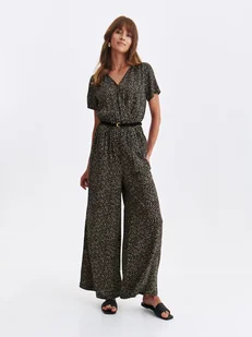 Kombinezon damski Top Secret z krótkim rękawem. Urzekający elegancją kombinezon damski o luźnym kroju w wersji z krótkim rękawem oraz efektownym dekoltem w serek, wzbogaconym ozdobną lamówką wokół. Uroku dodają mu praktyczne kieszenie po bokach oraz proste długie szerokie nogawki, jak i również gumka w talii, podkreślająca smukłość kobiecej sylwetki. Został on uszyty z miłej w dotyku oraz delikatnej dzianiny wiskozowej z wzorkiem na całości. Będzie on dobrym wyborem zarówno na wieczorną kolację, jak i również imprezę z przyjaciółmi.