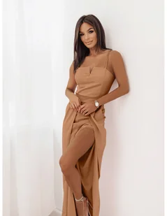 Kombinezon z rozcięciami na nogawkach ZALIJA - cappucino Prezentujemy elegancki damski kombinezon Zalija - to synonim klasy i wyrafinowanego stylu. Wykonany z lekko elastycznego materiału, gwarantuje idealne dopasowanie oraz swobodę ruchów, podkreślając atuty kobiecej sylwetki. Cienkie, regulowane ramiączka dodają subtelności, a usztywniane miseczki w dekolcie zapewniają komfort i wsparcie. Dyskretny kryty zamek na plecach pozwala na łatwe zakładanie. Unikalnym elementem są fantazyjne, szeroko rozchodzące się nogawki z ozdobnym rozcięciem, które nadają dynamiki i nowoczesnego charakteru.
