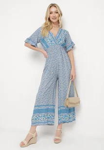 Niebieski Bawełniany Kombinezon z Gumkami w Pasie i Kopertowym Dekoltem Zapinany z Tyłu na Guziki Lorrania
