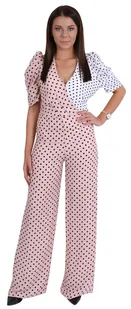 Różowo-biały kombinezon w czarne grochy z krótkimi, bufiastymi rękawami. Kombinezon posiada kopertowy dekolt oraz szerokie nogawki. Z tyłu znajduje się zapię...