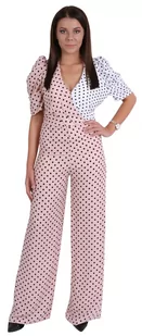 Różowo-biały kombinezon w czarne grochy z krótkimi, bufiastymi rękawami. Kombinezon posiada kopertowy dekolt oraz szerokie nogawki. Z tyłu znajduje się zapię...