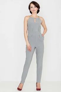 Szary Elegancki Kombinezon z Biżuteryjnym Akcentem Wiązany na Szyi
