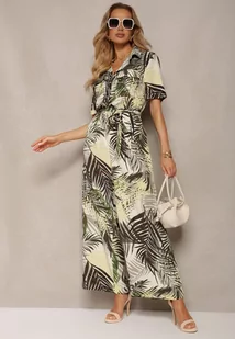 Zielono-Beżowy Kombinezon z Krótkim Rękawem z Gumką w Talii i Materiałowym Paskiem Efilove