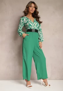 Zielono-Biały Kombinezon w Print z Paskiem i Szerokimi Nogawkami Stuvana