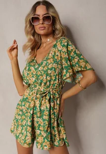 Zielono-Żółty Kombinezon w Kwiaty z Krótkim Rękawem z Gumką w Talii i Paskiem Biacelia