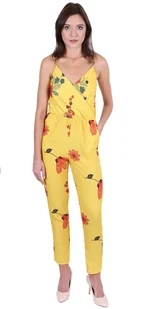 Żółty kombinezon na ramiączkach z motywem kwiatowym. Uszyty w bardzo eleganckim stylu. Po bokach znajdują się dwie kieszenie, w pasie gumka. Wykonany z miłeg...