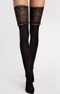 Pończochy samonośne z wysoką koronką Notte 40 DEN perfekcyjnie dopasowują się do nogi. Miękkie i komfortowe, półkryjące pończochy we wzór drobnych kropeczek w kolorze beżu. Zwieńcza je szeroka i bogata w wyrazie koronka w oryginalnych tonacjach czerni i nude. Model zapewnia znakomite przyleganie do nogi i komfort termiczny. Wysoka koronka z silikonowym podbiciem zapobiega zsuwaniu się pończoch.