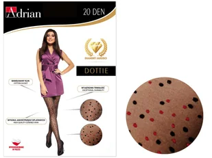Cechy sprzedawanych rajstop : DEN: 20 Typ: Wzorzyste Wykończenie: Półmatowe Cechy dodatkowe: Bezmajtkowe, Wzmocnione palce, W kropki groszki, Fantazyjny wzór...