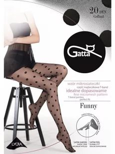 Bardzo ciekawe rajstopy marki Gatta zdobione kropkami. Wykonane z najwyższej jakości przędzy z dodatkiem Lycra Satin Sheers, dzięki czemu są matowe i idealnie dopasowują się do ciała. Skład: poliamid 92%, elastan 8%. Grubość 20 Den.