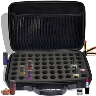 - 60 OTWORÓW NA BUTELECZKI Separator z pianki z 60 otworami na buteleczki z olejkami lub lakierem stanowi ddatkową ochronę podczas podróży, zmniejszając ryzyko potencjalnego rozlania czy uszkodzenia butelek z olejkami eterycznymi.