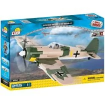 Jednomiejscowy i jednosilnikowy niemiecki myśliwiec z okresu II wojny światowej. Najlepszy niemiecki myśliwiec z tego okresu. Charakteryzował się bardzo dobrą wytrzymałością konstrukcji, dużymi odchylanymi pokrywami serwisowymi, które ułatwiały szybkie naprawy oraz ergonomicznie zaprojektowaną kabiną pilota. Wyprodukowany w ilości ponad 20 tysięcy egzemplarzy. Prototyp tego samolotu po raz pierwszy wzbił się w powietrze 1 czerwca 1939 roku. Od lipca 1942 roku wersja Fw 190 A-4 weszła do produkcji. Uzbrojenie jego stanowiły karabiny maszynowe 2 x MG17 i działka 2x MG 151/20, 2 x FF/M. Do konstrukcji Fw 190 A użyto po raz pierwszy instalacji MW50, która wtryskiwała do silnika mieszaninę metanolu z wodą, efektem czego było zwiększenie osiągów mocy poniżej pułapu. Zestaw Focke - Wulf Fw 190 A-4 zawiera 255 klocków i figurkę pilota. Myśliwiec ten może okazać się ciekawym pomysłem na prezent dla dziecka. Budowanie z klocków może przynieść młodemu człowiekowi wiele korzyści w kierunku rozwoju myślenia przestrzennego, doprecyzowania małej motoryki, czy też ćwiczenia umiejętności zogniskowania uwagi na jednej czynności w danym momencie. Zabawa klockowymi modelami maszyn z okresu II wojny światowej to także styczność z historią, która sprawia, że dziecko chcę dowiedzieć się na ten temat czegoś więcej.