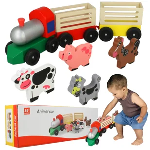 dł 6,3 x 6,2 cm materiał: drewno waga: 700 gram wiek: od 3 lat Zestaw zawiera: 1x lokomotywa 2x wagonik 4 zwierzątka: