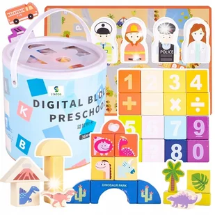 - Mnogość różnorodnych kształtów i form klocków drewnianych Zestaw zawiera kocki drewniane o różnorodnych kształtach i kolorach, które są uzupełnione o specjalne obrazki na płaskich powierzchniach.
