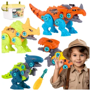 DINOZAURY DO SKRĘCANIA ROZKRĘCANIA z wkrętakiem ręcznym - Zestaw 4 FIGURKI + kuferek