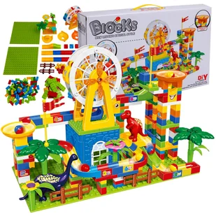Urodziny, święta, pod choinkę — zabawka, która uczy i bawi, a rodzice docenią jej walory edukacyjne i sensoryczne WYMIARY : Wymiary opakowania: 44 x 27,5 x 9,5 cm 2 x podkładka konstrukcyjna o wym: 25,5 x 25,5 cm 6 x kulka o średnicy ok. 2,5 cm 2 figurki dinozaurów (Tyranozaur ok. 12,5 cm, Diplodok 10 x 17 cm) koło młyńskie: