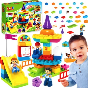 Bezpieczne, duże elementy idealne dla małych rączek ✨Możliwość powiększenia zestawu ✔️ Zestaw jest kompatybilny z popularnymi klockami dla małych dzieci ✨Zawartość zestawu: 68 elementów konstrukcyjnych 3 figurki dzieci/postaci Karuzela do samodzielnego złożenia Zjeżdżalnia Budka tematyczna (lody, bilety) Dodatki: Barierki, kwiatki, dekoracje ✨Zalety produktu ✔️ Wspiera rozwój wyobraźni i kreatywności – dzieci samodzielnie budują i aranżują przestrzeń placu zabaw ✔️ Zachęca do zabawy w odgrywanie ról – tworzenie historii z figurkami pomaga rozwijać mowę i inteligencję emocjonalną ✔️ Ćwiczy zdolności manualne – duże klocki ułatwiają chwytanie i budowanie, wspierając rozwój małej motoryki ✔️ Kolorowe elementy przyciągają uwagę – idealne do długich godzin wciągającej zabawy ✔️ Solidne wykonanie i bezpieczeństwo – materiały dostosowane do potrzeb najmłodszych dzieci ✔️ Gotowy pomysł na prezent – efektowne opakowanie i uniwersalna tematyka sprawiają, że zestaw idealnie nadaje się na urodziny czy święta ✨Zestaw Family Playground to nie tylko zabawa, ale i rozwój! ✨Kreatywne budowanie, ruch, wyobraźnia i radość na twarzy dziecka gwarantowane! https://upload. cdn. baselinker. com/products/3039922/b773fc520aa5cc3c56b3809d773aea17.
