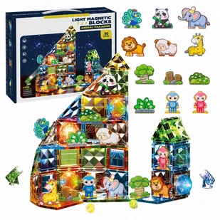 KLOCKI MAGNETYCZNE ZOO DLA DZIECI ZWIERZĄTKA ŚWIECĄCY ZESTAW LED 90 EL MAGNETYCZNE KLOCKI KONSTRUKCYJNE – ZOO Z OŚWIETLENIEM LED, AŻ 90EL. Stwórz własny świecący ogród zoo! Kolorowe klocki łączone magnesami – idealne na prezent! Zestaw pozwala dzieciom tworzyć niezwykłe budowle i obserwować jak światło przenika przez przezroczyste ścianki, tworząc magiczne efekty świetlne na ścianach i podłodze. Kolekcja łączy magię kolorowych klocków magnetycznych z wielokolorowymi świetlnymi efektami LED! Każda zabawa to okazja do rozwijania wyobraźni przestrzennej i zdolności manualnych. Najważniejsze cechy: Wysoka jakość wykonania Przezroczyste panele z efektem „szlifowanego diamentu” – pięknie rozszczepiają światło Magnesy ukryte w ramkach – łatwe i trwałe łączenie Figurki i dekoracje: