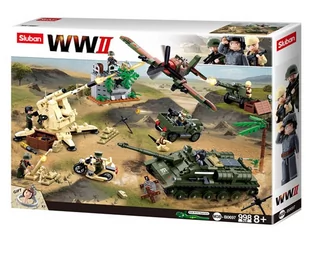 KLOCKI SLUBAN Bitwa pod Kurskiem MODEL: M38-B0697 SERIA: WWII, Army LICZBA ELEMENTÓW: 998 ZESTAW: CZOŁG, SAMOLOT, AUTO WOJSKOWE, 2X DZIAŁO, MOTOCYKL, 9X LUDZIKI KOMPATYBILNOŚĆ Z: