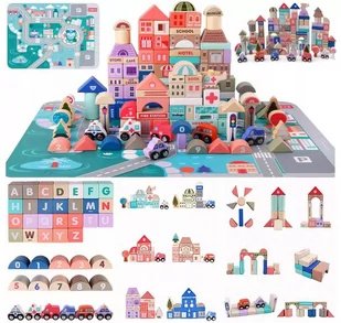 WSPANIAŁY ZESTAW KOLOROWYCH EDUKACYJNYCH DREWNIANYCH KLOCKÓW - MIASTO 115 ELEMENTÓW Zestaw składający z ze 115 elementów charakteryzuje precyzyjne wykonanie, klocki pięknie pomalowane bezpiecznymi dla dzieci farbami, zapakowane w estetyczne pudełko z polskiej dystrybucji (napisy na pudełku w polskim języku). Z klocków można zbudować wspaniałe miasto, z licznymi budynkami, można ustawić pojazdy, drzewa znaki. Z klocków można budować różne kompozycje. Można zbudować budynki: komisariat policji sklep szpital muzeum bank księgarnię szkołę budynek straży pożarnej kawiarnię hotel W zestawie także pojazdy: