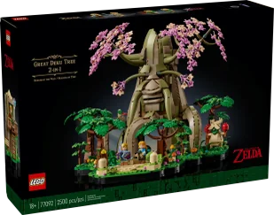 Zestaw konstrukcyjny 2 w 1 dla dorosłych — zawiera drzewo Great Deku Tree z różnymi elementami i funkcjami oraz cztery minifigurki: figurkę bohaterki — księżniczki Zeldy — i trzy wersje Linka