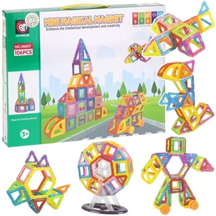 - 64 klocki magnetyczne (kolory mogą różnić się od przedstawionych na zdjęciach) - 16 paneli imitujących ściany - 4 panele imitujące balkon - 12 paneli imitujące trzy rodzaje okien - 2 koła z podwoziem - 8 różnych elementów - obrazkową instrukcję składania z przykładowymi konstrukcjami Ilość elementów: