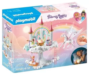Niebiański tęczowy zamek Playmobil Princess Magic przenosi dziewczynki do romantycznej krainy w chmurach, gdzie urocze księżniczki i magiczne stworzenia przeżywają niezwykłe przygody. Niebiański tęczowy zamek jest 114-elementowym zestawem, dzięki któremu zbudujesz i ozdobisz najprawdziwszy dom księżniczek! Ten piękny pałacyk jest chroniony przez magiczne światło tęczowego kwiatu. Wewnątrz opakowania znajdziesz naklejki do udekorowania zamku - zrób to tak, jak czujesz! Pragniesz stworzyć kompletną scenerię zabawy Princess Magic? Połącz prezentowany zestaw z Niebiańską przebieralnią 71408 i Niebiańskim tęczowym zamkiem 71359 (sprzedawane oddzielnie).