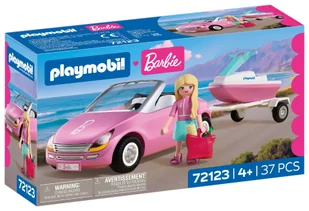Playmobil Barbie Kabriolet 72123. Klocki. W drogę w kabriolecie Barbie™ – Twoja letnia przygoda zaczyna się teraz!Brummm – Barbie jedzie słoneczną nadmorską drogą w swoim kabriolecie, wiatr tańczy we włosach Na przyczepce: supercool skuter wodny, gotowy na akcję — wodna. . .
