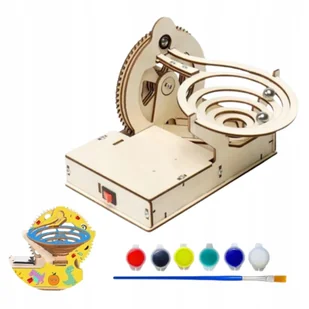 15cm; wysokość: 12cm; szerokość: 9,5cm. Zestaw zawiera: 21x drewniany element montażowy; 3x metalowa kulka; 1x opakowanie z wkrętami; 1x wkrętak; 1z przycisk zasilający; 1x pudełko na baterie; 1x kabel montażowy; 1x silnik; 1x zestaw 12 kolorowych farbek; 2x pędzelek.