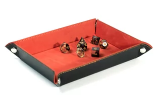 Dice tray jest wykonany ze skóry, a w środku wyłożony aksamitem. W narożnikach znajdują się wytrzymałe, metalowe napy dzięki którym możemy płaską matę zmienić w miseczkę do rzucania koścmi. Po rozłożeniu mata ma rozmiar 27x21 cm, po złożeniu przestrzeń do rzucania wynosi 22x16 cm. Kolor tacki: czerwony Dice tray wielkości 22x16 cm wykonany ze skóry i aksamitu.