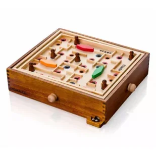 Za pomocą dwóch bocznych pokręteł przechylaj planszę z labiryntem tak, aby kulka przeszła od startu do mety, nie wpadając przy tym do otworów. Dodatkowe utrudnienia można pokonać za pomocą specjalnych kołeczków, które włożone w dowolnie wybrane otwory uniemożliwią wpadnięcie kulki. | Zalecany wiek: 5+ | Wymiary produktu: 28,5 x 32 x 7,5 cm