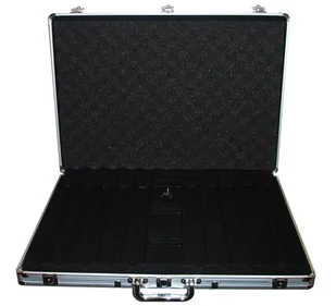 Walizka na żetony wykonana z aluminium i tworzywa sztucznego. Stalowe okucia, zamki i uchwyt. Środek wykończony miękkim czarnym welurem. Pokrywa wyłożona od ...