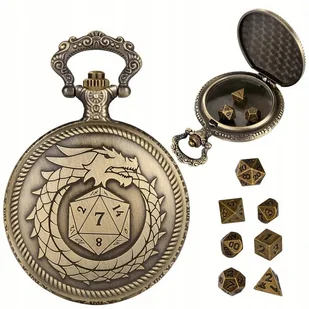 Niezwykły zestaw dla miłośników gier RPG! Metalowe pudełko w kształcie zegarka kieszonkowego z motywem smoka pożerającego własny ogon kryje 7 mini kości RPG....