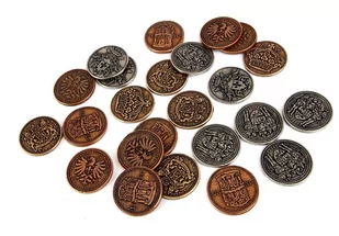 Mają praktycznie nieograniczoną ilość zastosowań - sprawdzają się jako realistyczne żetony w takich grach planszowych, jak Cytadela, Gra o Tron czy Zamki Szalonego Króla Ludwika. Są też klimatycznym dodatkiem do sesji RPG oraz nieodzownym elementem LARPów! To najwyższej jakości monety. Są ciężkie - pojedyncza waży tyle co 3 lub 4 pięciozłotówki i ma też o około 5 mm większą średnicę. W zestawie znajduje się: 5x moneta miedziana 4x moneta srebrna 3x moneta złota Wykonany ze stopów cynku zestaw 12 cudownych, ciężkich monet, które wydobyliśmy z zapomnianego, średniowiecznego skarbca.