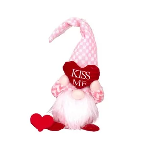 Maskotka - siedzący krasnal z sercem z napisem "Kiss Me" - czapka w różową pepitkę