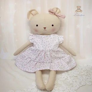 Przeurocza przytulanka, miś, a właściwie misia w kolorze beżowym, uszytq ręcznie z najwyższą starannością, ubrana w uroczą sukieneczkę z falbankami w kolorze bieli w drobne, różowe kwiatuszki. Uszko ozdobione ko ...