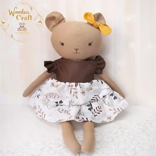 Przeurocza przytulanka, miś, a właściwie misia w kolorze ciemnego beżu, uszyta ręcznie z najwyższą starannością, ubrana w uroczą sukieneczkę z falbankami w kolorze brązu z motywem kwiatowym, z musztardową ...