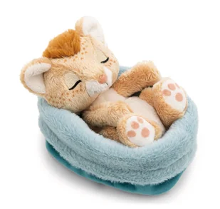Śpiące lwię, wykonane z puszystego, miękkiego pluszaka NICI, jest urzekające swoim uroczym wyglądem i przyjemnym klimatem. To po prostu urocze! Niezależnie od tego, czy chodzi o przytulanie, zabawę, pocieszenie czy zasypianie – szczegółowy, mały dziki kot o jasnym, pluszowym ciele, krótkiej grzywie i puszystym ogonie jest zawsze pod ręką. Z haftowanymi śpiącymi oczami, które emanują spokojem i bezpieczeństwem, leży zrelaksowany w niebieskim, pluszowym koszyku, który wygląda jak przytulne gniazdo. Zarówno pluszowego lwa, jak i pluszowego koszyka można bawić się osobno.