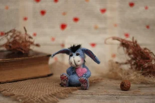 Autorski prodikt kolekcjonerski Osiołek miniaturka, wykonany metodą filcowania na sucho z wełny merynos. Wysokość 8 cm. Serduszko 3 cm Ruchome kończyny. Produkt eko. ...